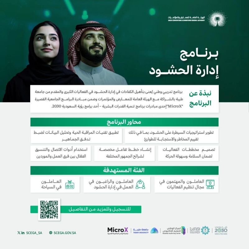 أعلنت الهيئة العامة للمعارض والمؤتمرات، بالتعاون مع جامعة طيبة Taibahu عن إطلاق برنامج إدارة الحشود، ضمن مبادرة البرامج الجامعية القصيرة MicroX ، وذلك بهدف تأهيل وتمكين الكفاءات الوطنية بالمهارات المتخصصة في إدارة وتنظيم الحشود في الفعاليات والمؤتمرات الكبرى.