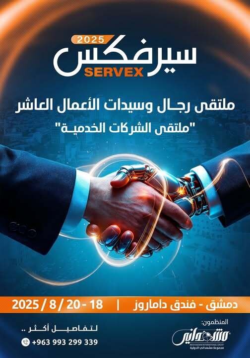 في خطوة جديدة تؤكد التزامها بتعزيز بيئة الأعمال والخدمات الاحترافية، تستعد مجموعة مشهداني الدولية للمعارض والمؤتمرات لإطلاق فعاليات "سيرفكس 2025" – المعرض الدولي لخدمات رجال وسيدات الأعمال، وذلك في فندق داماروز بدمشق خلال الفترة من 18 إلى 20 أغسطس 2025.
