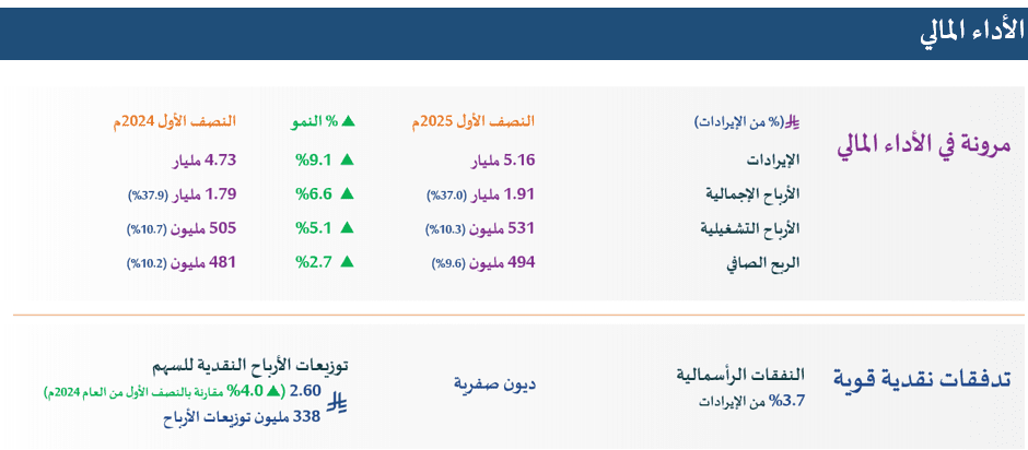 وفي الربع الثاني من عام 2025م، شهدت الإيرادات نمواً بنسبة 2.2%، بينما انخفض صافي الربح بنسبة 3.8%، وتأتي نتائج الربع الثاني في أعقاب أداء قوي للربع الأول من هذا العام، وقاعدة مبيعات أعلى في الربع المماثل من العام السابق، نتيجة عامل الموسمية.