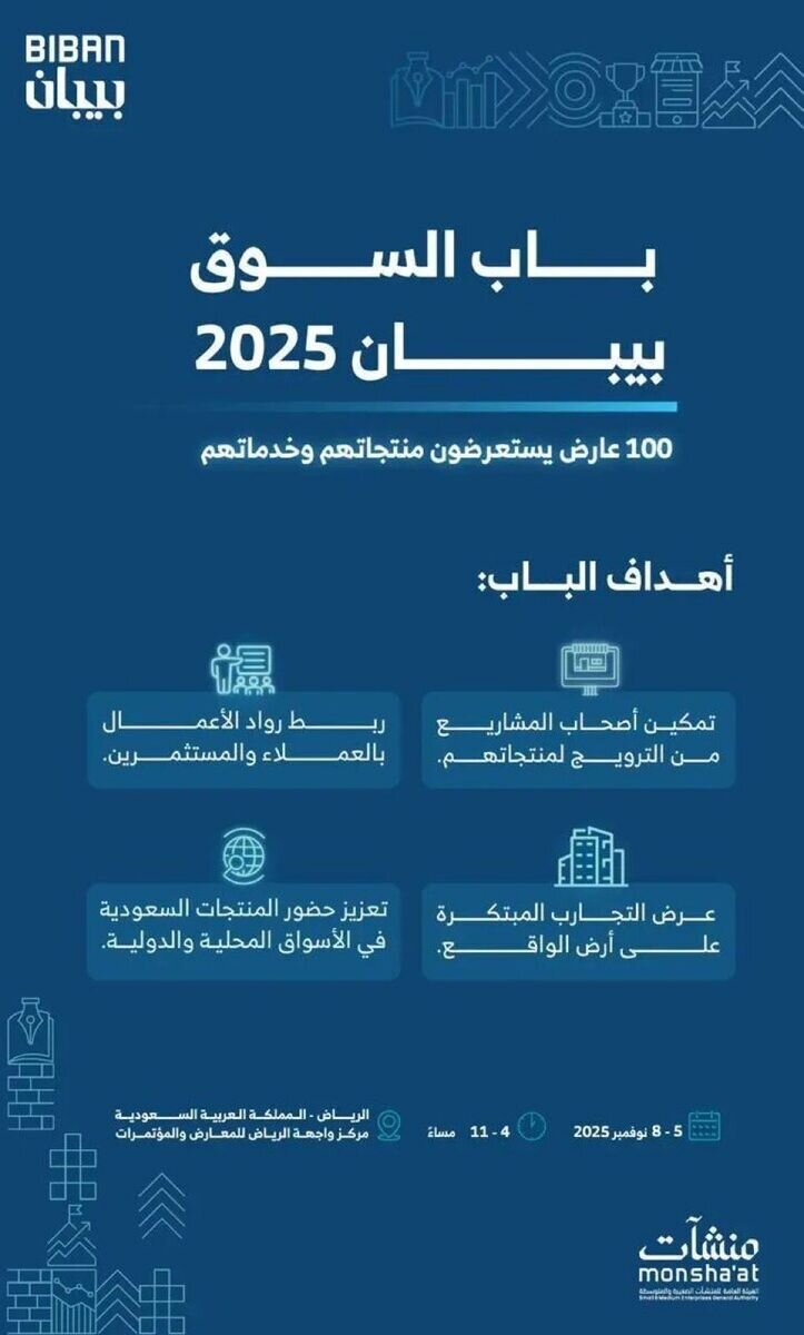 يحتضن ملتقى "بيبان 2025"، الذي تنظمه الهيئة العامة للمنشآت الصغيرة والمتوسطة "منشآت" خلال الفترة من 5 إلى 8 نوفمبر المقبل في مركز واجهة الرياض للمعارض والمؤتمرات، تحت شعار "وجهة عالمية للفرص"، أكثر من (100) عارض من رواد الأعمال وأصحاب المنشآت الصغيرة والمتوسطة من داخل المملكة وخارجها ضمن " باب السوق".