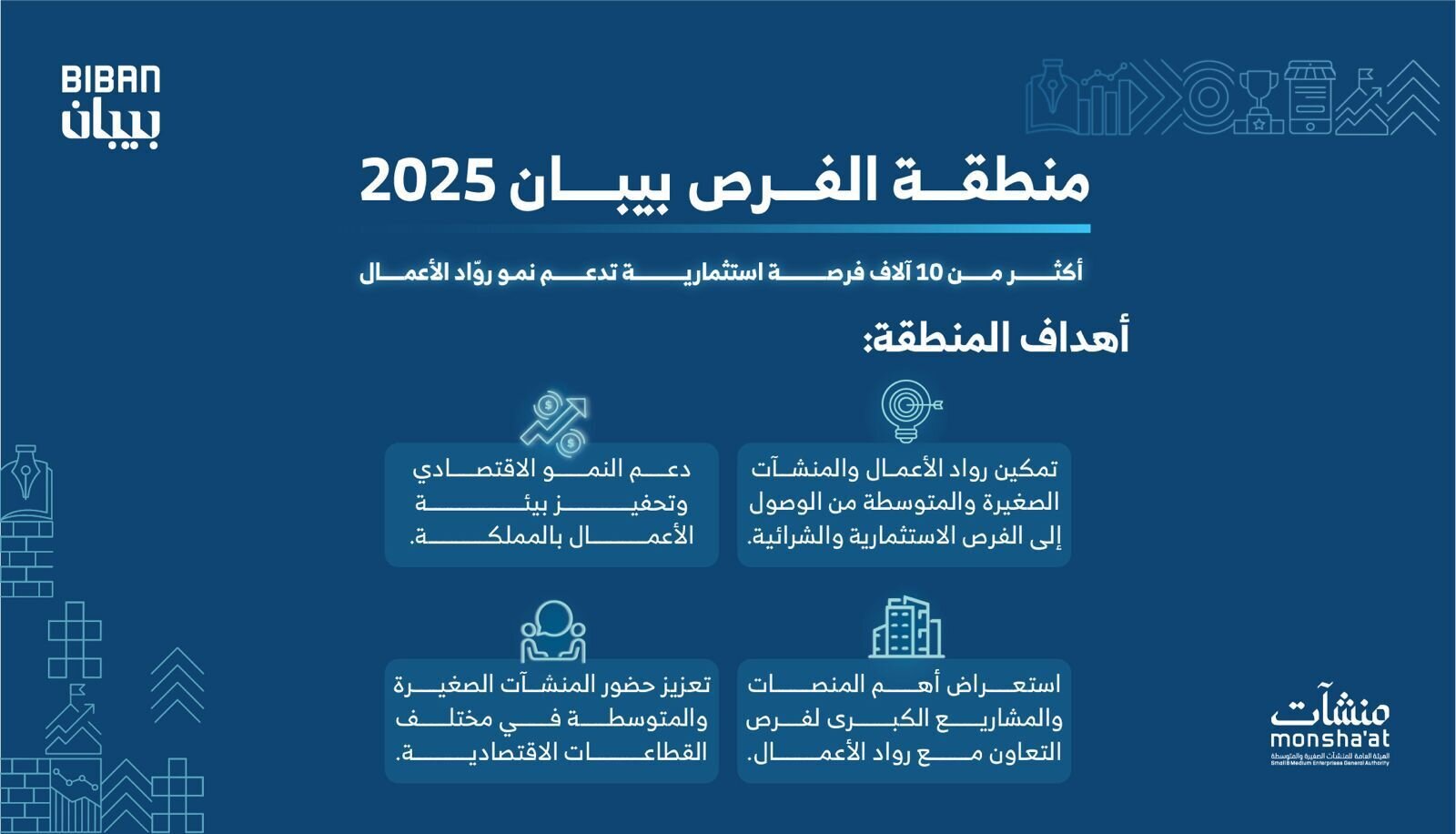 كشفت الهيئة العامة للمنشآت الصغيرة والمتوسطة "منشآت" عن (10) آلاف فرصة استثمارية لرواد الأعمال وأصحاب المنشآت الصغيرة والمتوسطة سيتم استعراضها ضمن "منطقة الفرص" في فعاليات ملتقى "بيبان 2025"، الذي يُقام خلال الفترة من 5 إلى 8 نوفمبر المقبل في مركز واجهة الرياض للمعارض والمؤتمرات تحت شعار "وجهة عالمية للفرص".