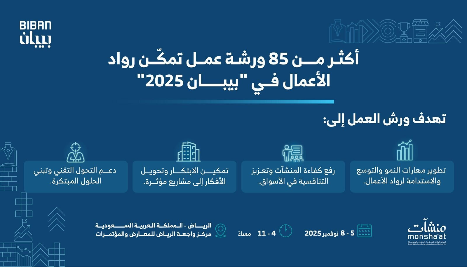 يحتضن ملتقى "بيبان 2025"، الذي تنظمه الهيئة العامة للمنشآت الصغيرة والمتوسطة "منشآت" خلال الفترة من 5 إلى 8 نوفمبر المقبل في مركز واجهة الرياض للمعارض والمؤتمرات، تحت شعار "وجهة عالمية للفرص"، أكثر من (85) ورشة عمل متخصصة تهدف لتمكين رواد الأعمال وأصحاب المنشآت الصغيرة والمتوسطة من نمو وتوسع واستدامة مشاريعهم؛ عبر مسارات معرفية وتطبيقية متنوعة وفقًا لأحدث التوجهات العالمية في ريادة الأعمال.