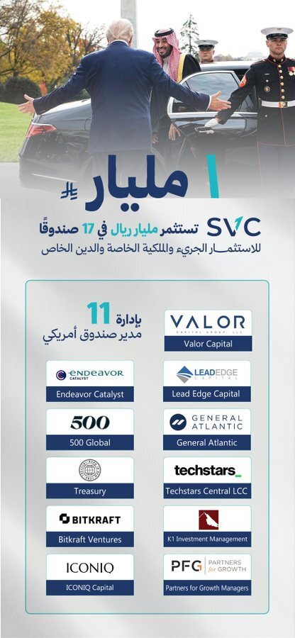 أعلنت الشركة السعودية للاستثمار الجريء (SVC) عن استثمارات مشتركة بقيمة مليار ريال في 17 صندوقًا للاستثمار الجريء والملكية الخاصة والدين الخاص تُدار من قِبل 11 مدير صندوق أمريكي، بما يعزز فرص الشراكة الاقتصادية بين المملكة والولايات المتحدة ويُسهم في دعم نمو الشركات التقنية والابتكارية في مراحلها المتقدمة.