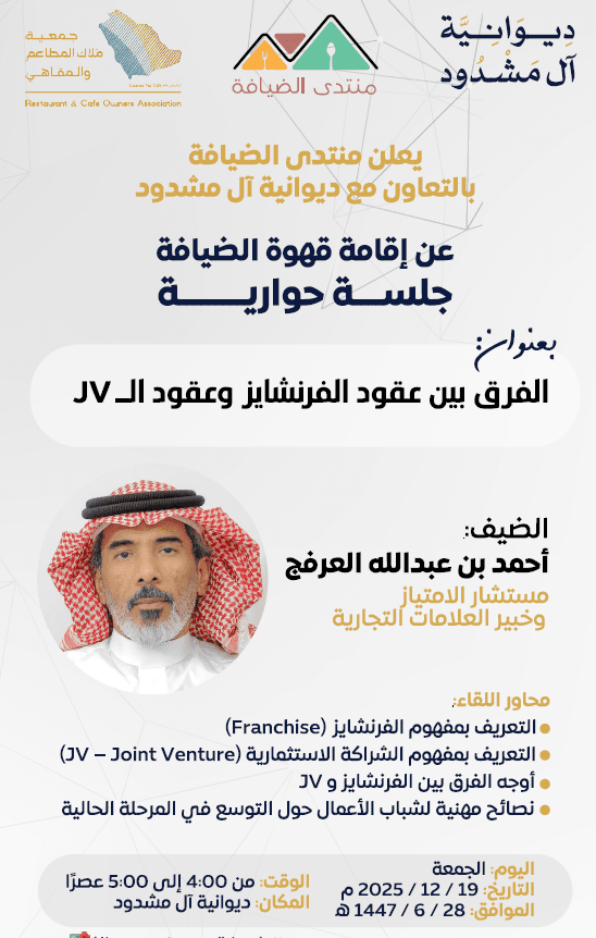 أعلن منتدى الضيافة بالتعاون مع ديوانية آل مشدود عن تنظيم جلسة حوارية ضمن فعاليات "قهوة الضيافة"، وذلك لمناقشة واحد من أهم الموضوعات التي تشغل رواد الأعمال في قطاع الأعمال والضيافة، وهو الفرق بين عقود الامتياز التجاري (Franchise) وعقود الشراكة الاستثمارية (JV – Joint Venture).