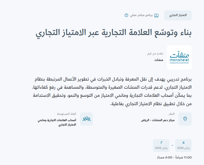 أعلنت الهيئة العامة للمنشآت الصغيرة والمتوسطة "منشآت" عن إطلاق برنامجها التدريبي الجديد "بناء وتوسّع العلامة التجارية عبر الامتياز التجاري"، الذي يأتي ضمن جهودها المستمرة لتمكين رواد الأعمال وأصحاب العلامات التجارية من التوسع المستدام عبر نموذج الامتياز التجاري، وتعزيز قدرات المنشآت الصغيرة والمتوسطة في هذا القطاع الحيوي.