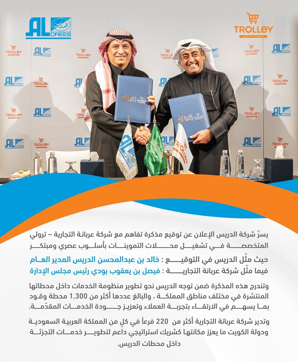 أعلنت شركة عربانة التجارية – المالكة لسلسلة ترولي عن توقيع مذكرة تفاهم استراتيجية مع شركة الدريس للخدمات البترولية والنقليات، بهدف افتتاح عدد من الفروع داخل محطات الدريس في مختلف مناطق المملكة العربية السعودية، بما يعزز انتشارها ويقدم تجربة تسوق عصرية وسريعة لعملائها.