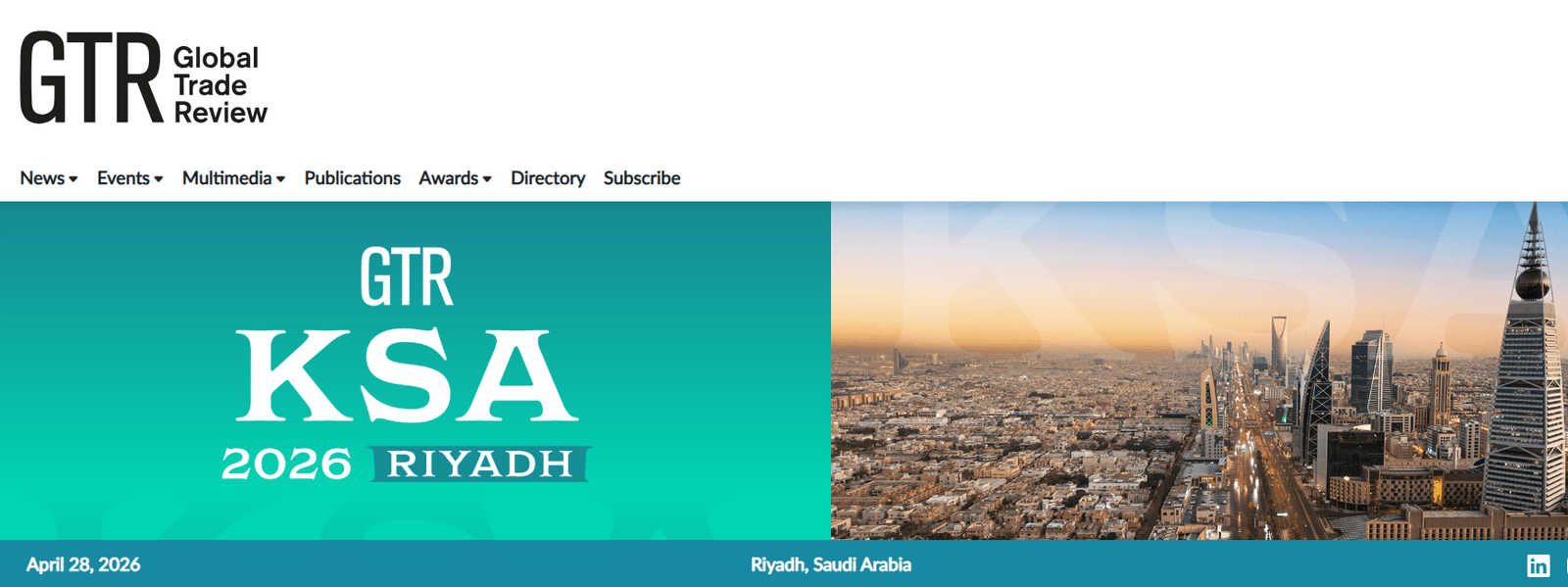 وتُعد Global Trade Review (GTR) جهة عالمية رائدة في تنظيم الفعاليات وتقديم الأخبار والتحليلات لقطاعات التجارة وتمويل الصادرات وسلاسل الإمداد. وتستضيف أكثر من 20 مؤتمرًا دوليًا سنويًا، مما يجعلها منصة محورية للمعرفة والتواصل المهني.